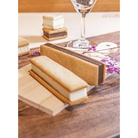 スイートとホワイトの詰合せ5個(スイート3個・ホワイト2個) 深く濃い味わいの生チョコレートをそっとはさむビスケットは、フランス西海岸ブルターニュ地方のゲランド塩を使用。甘さとしょっぱさのハーモニーをお楽しみください。