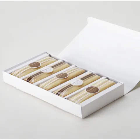 【ホワイト】チョコレート、バター、砂糖、鶏卵、牛乳、小麦粉、ゲランド塩、水あめ、レシチン、キリッシュ